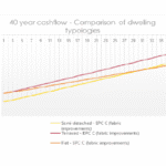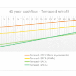 Across all three dwelling types modelled, the EPC fabric improvement retrofit achieves a return when allowing for match funding. For terraced houses the cashflow becomes positive after just 28 years.